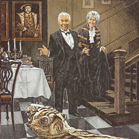 Gør din nytårsfest ekstra festlig med disse unikke servietter, der hylder Miss Sophie og Butleren James' berømte middag. "The same procedure as every year!"