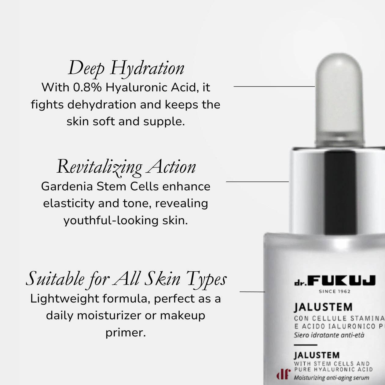 Ansigtsserum formuleret til at modvirke dehydrering og tab af elasticitet, beriget med 0,8% hyaluronsyre og gardenia stamceller, for en målrettet behandling der holder huden blød, fast og synligt yngre.