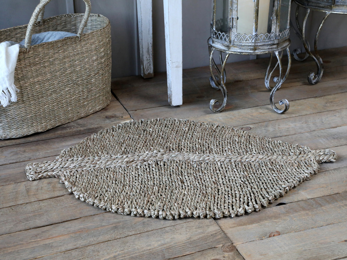 Skab en varm og naturlig atmosfære i dit hjem med denne smukke måtte i bladform, håndlavet af ægte søgræs. Det organiske design og de naturlige materialer bringer et stykke natur ind i din indretning.